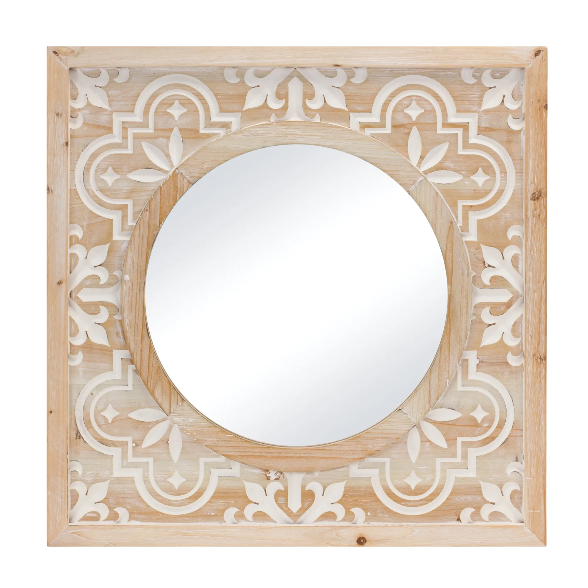Enhance your space with the Ornate Wood Wall Mirror. Featuring an intricate carved artwork, natural wood and a white-washed finish, this modern wall mirror is the perfect addition to any room. Crafted with a solid wood frame and delicate glass mirror for durability, this ornate piece can bring a classic yet elegant touch to your home decor. With the Ornate Wood Wall Mirror, you can transform your space into an inviting and stylish sanctuary.