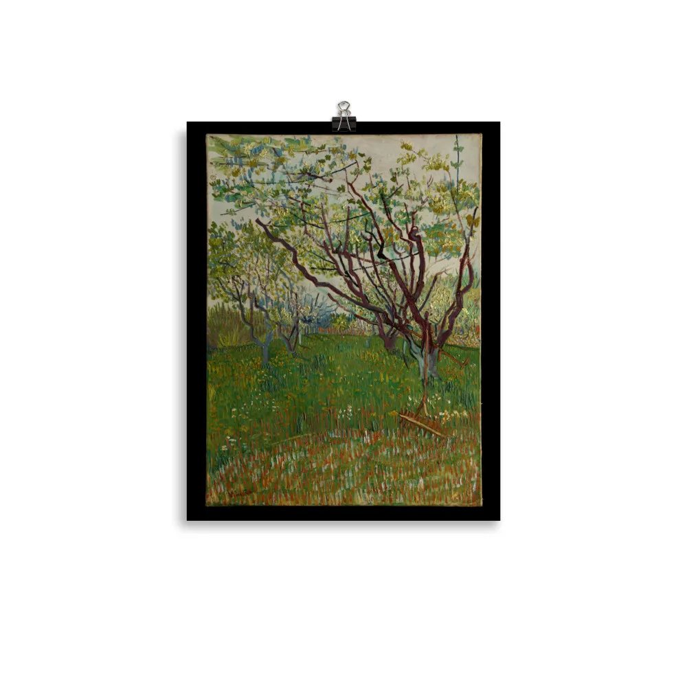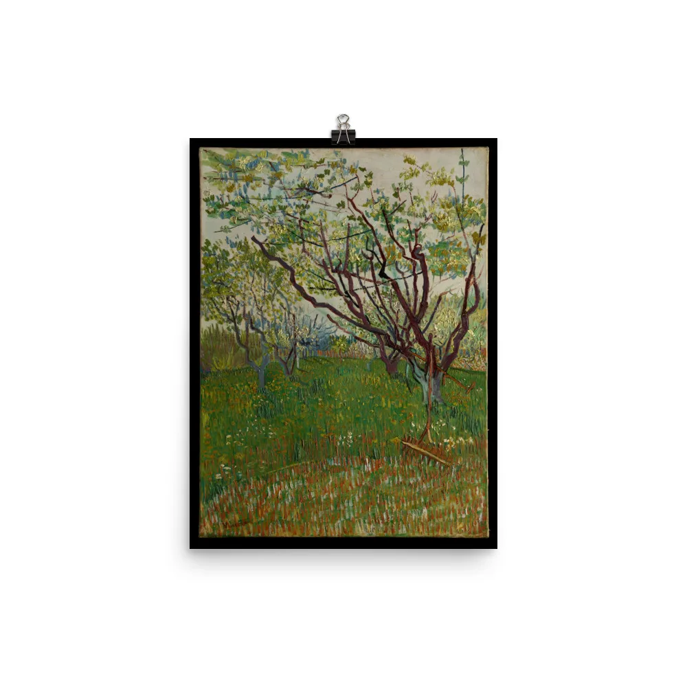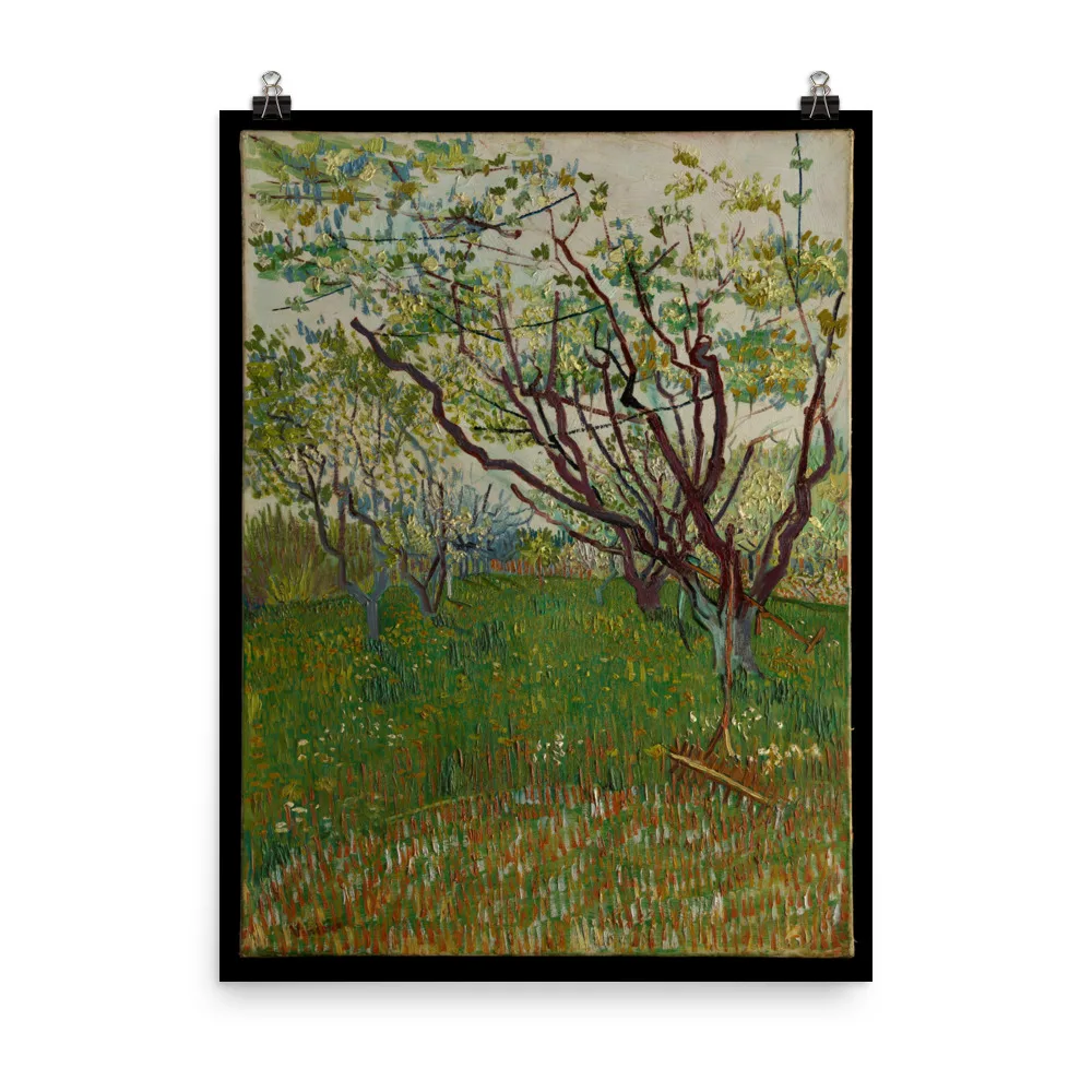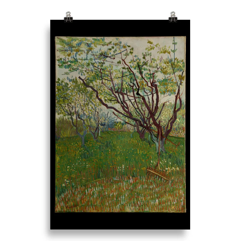 The arrival of spring in Arles in 1888 found Van Gogh “in a fury of work.” As he wrote to his brother Theo, “the trees are in blossom and I would like to do a Provençal orchard of tremendous gaiety.” Between late March and late April, the artist dedicated fourteen canvases to the subject, working in a range of sizes, formats, and styles. This composition, dominated by the angular, elongated branches of the budding trees, attests to Van Gogh’s admiration for Japanese prints. His inclusion of the scythe and rake makes this one of only two orchard paintings to hint at a human presence.