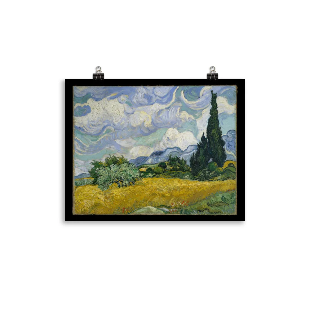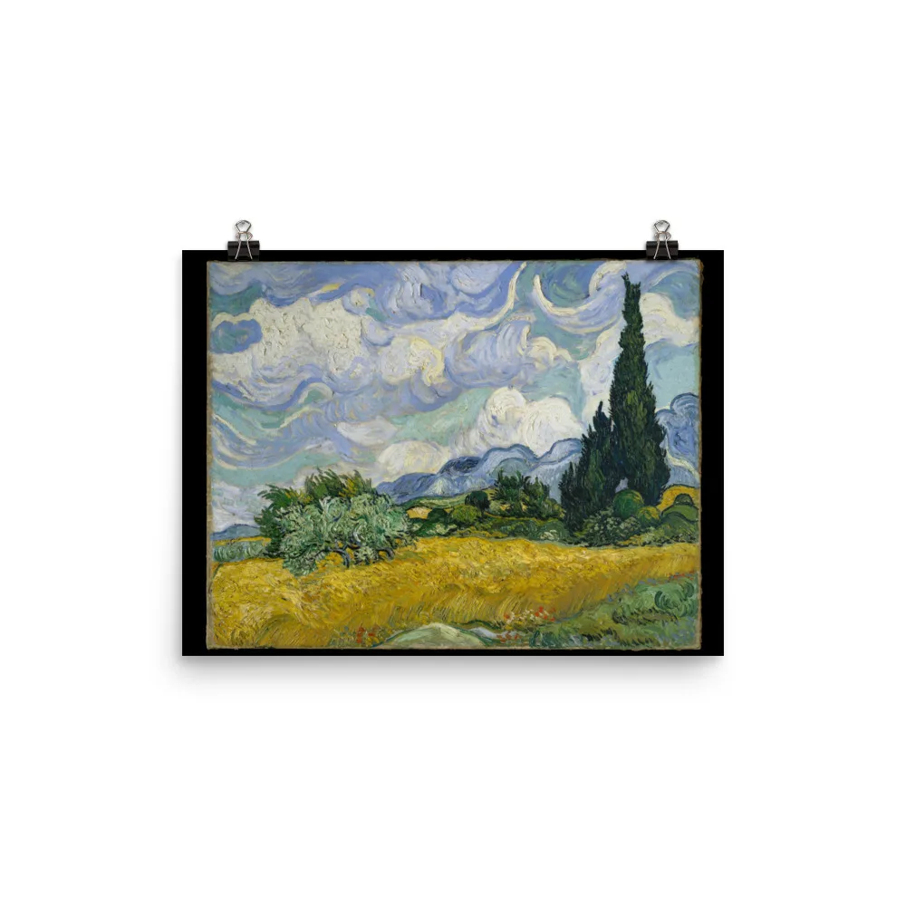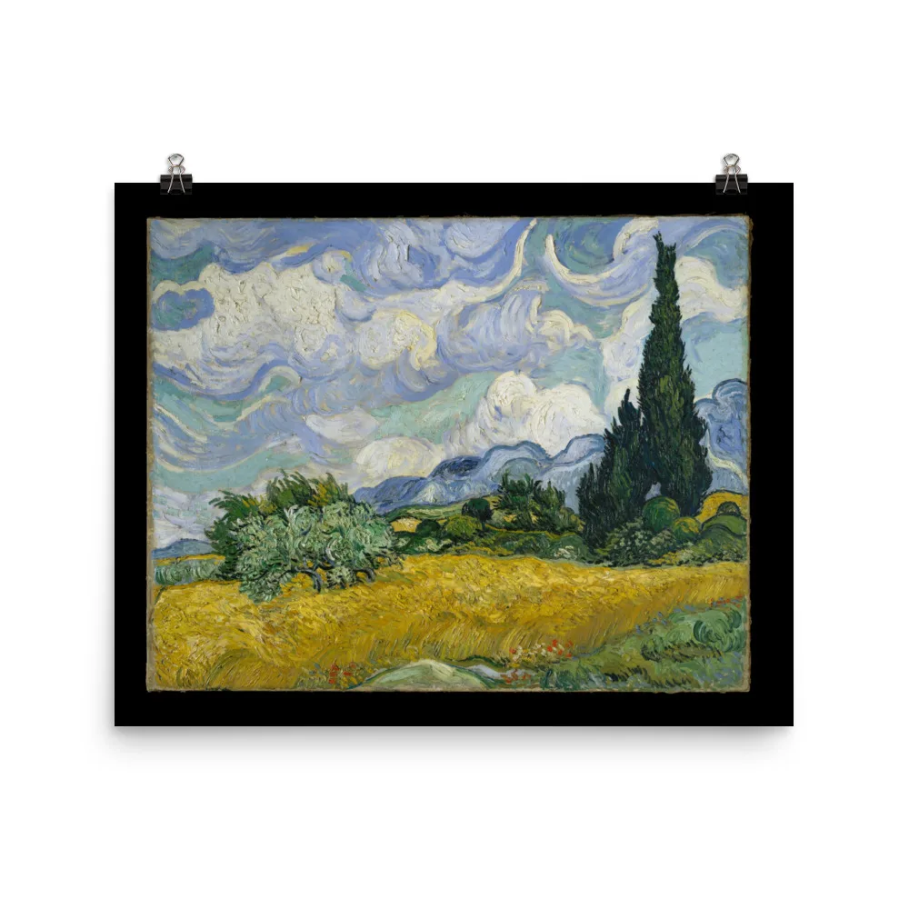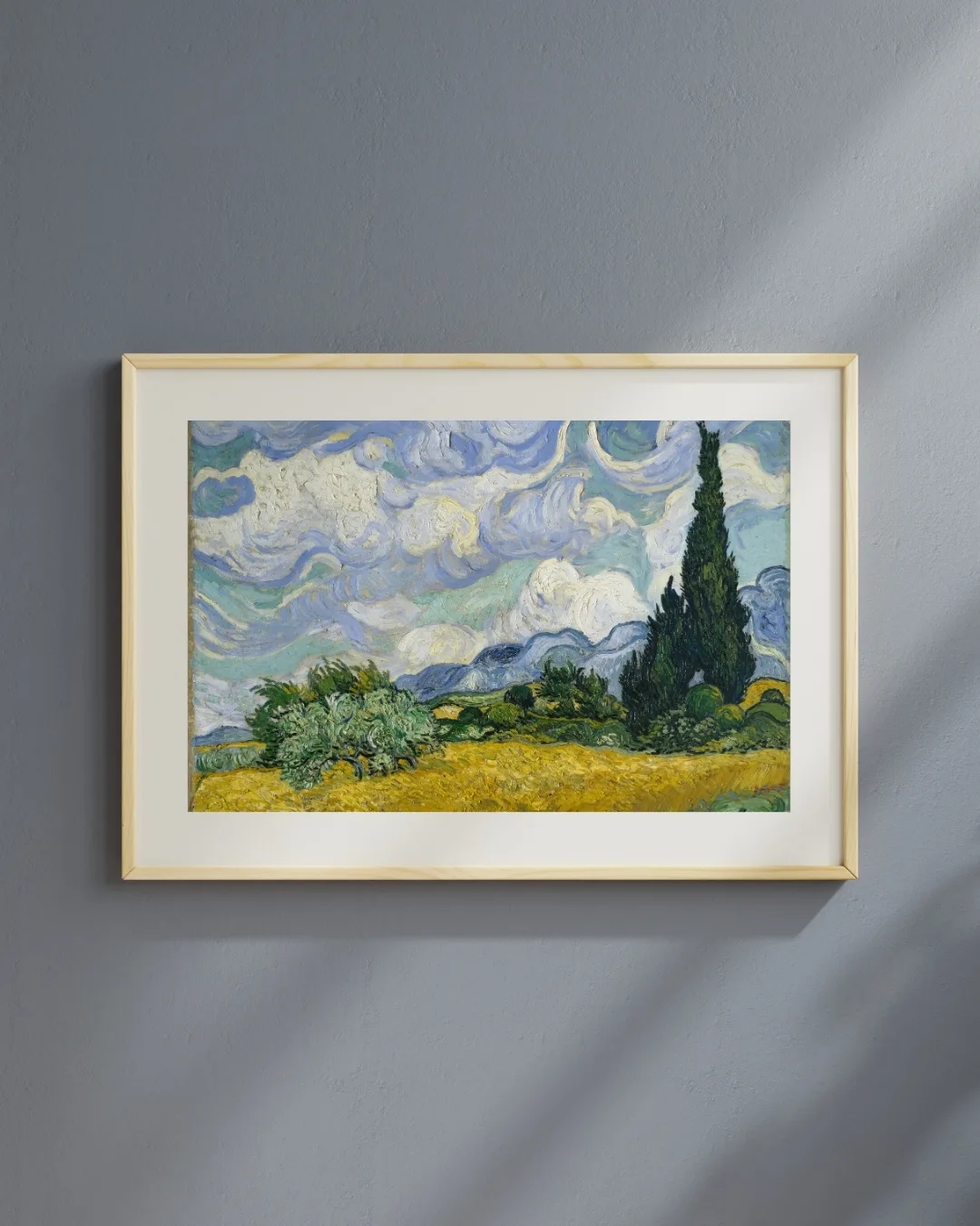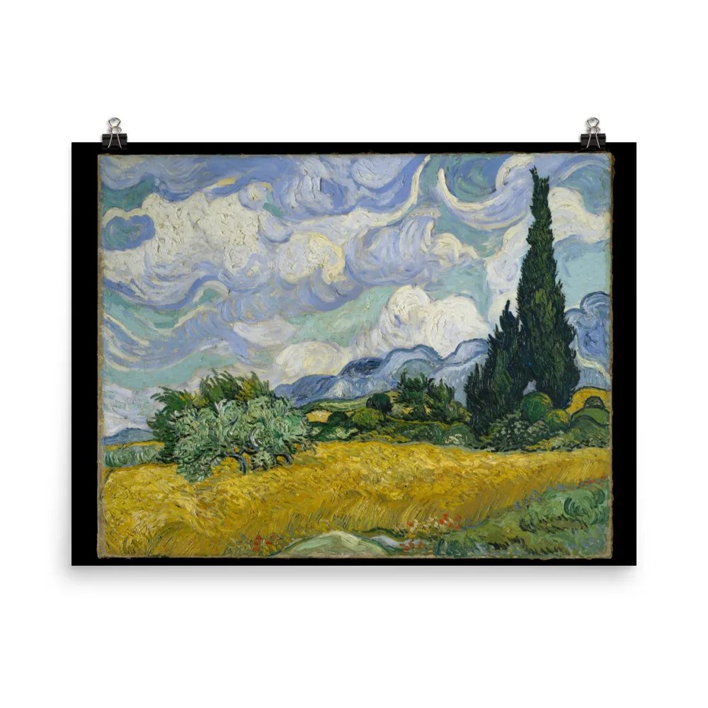 Cypresses gained ground in Van Gogh’s work by late June 1889 when he resolved to devote one of his first series in Saint-Rémy to the towering trees. Distinctive for their rich impasto, his exuberant on-the-spot studies include the Met’s close-up vertical view of cypresses (49.30) and this majestic horizontal composition, which he illustrated in reed-pen drawings sent to his brother on July 2. Van Gogh regarded the present work as one of his “best” summer landscapes and was prompted that September to make two studio renditions: one on the same scale (National Gallery, London) and the other a smaller replica, intended as a gift for his mother and sister (private collection).