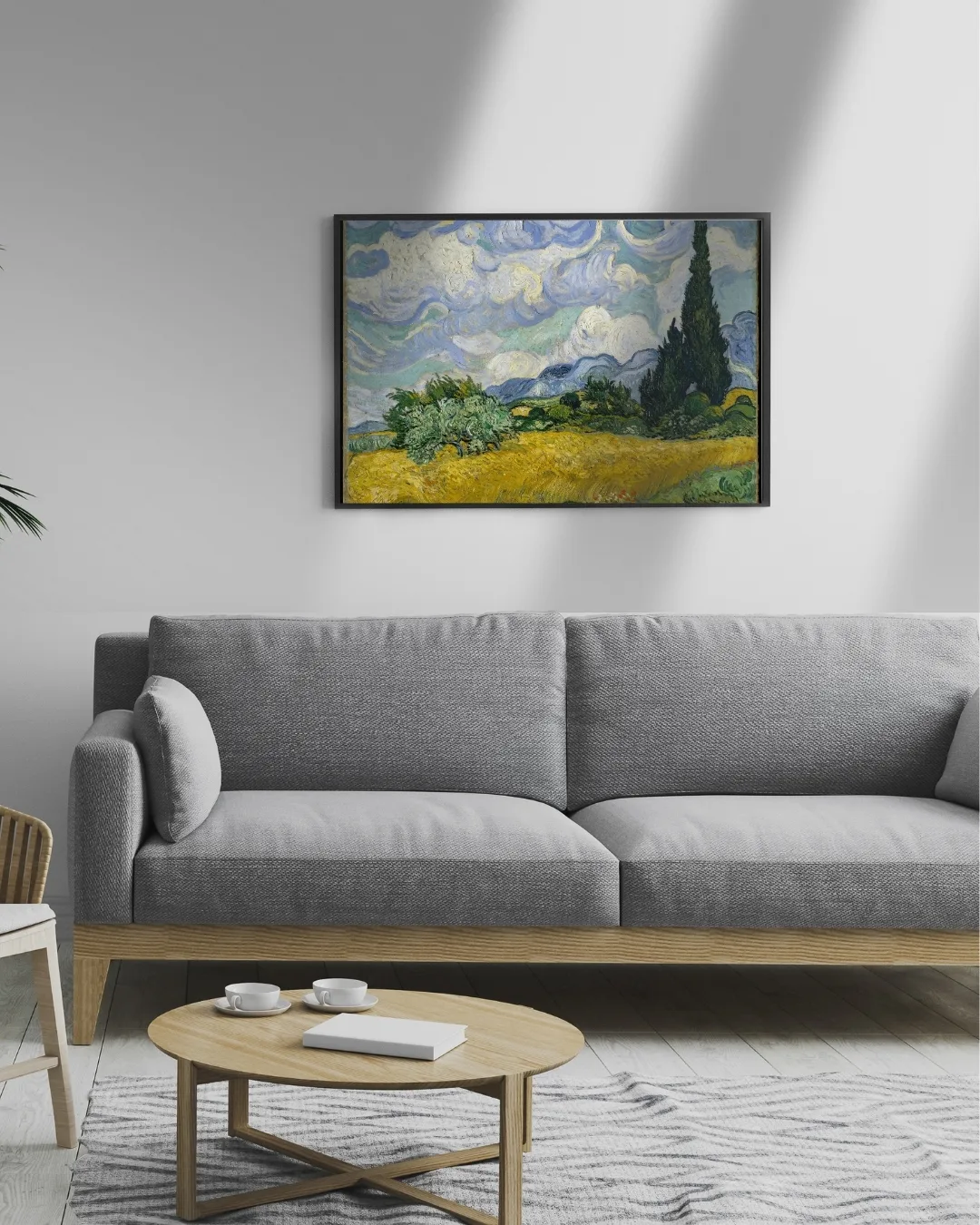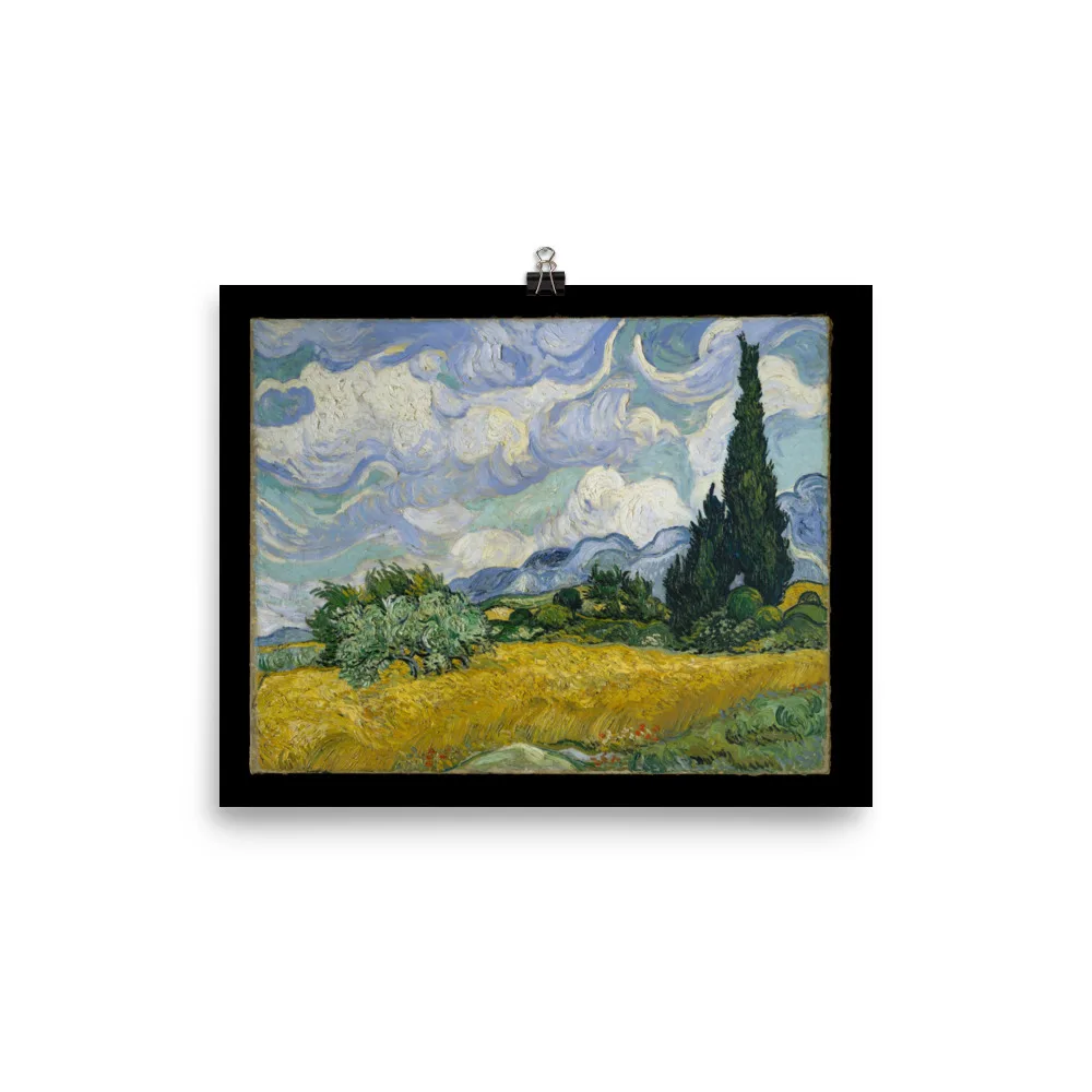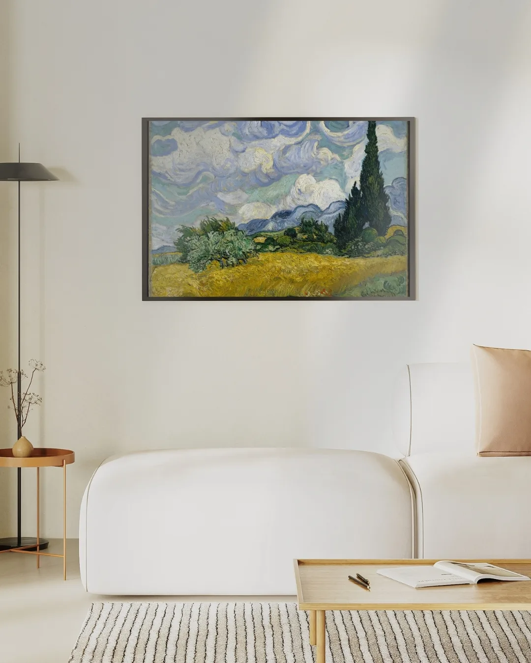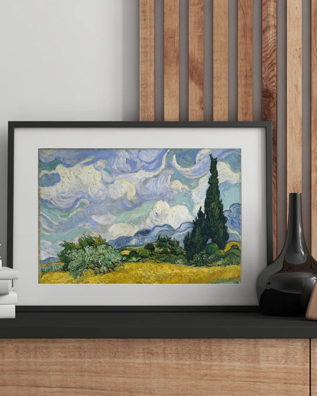 Cypresses gained ground in Van Gogh’s work by late June 1889 when he resolved to devote one of his first series in Saint-Rémy to the towering trees. Distinctive for their rich impasto, his exuberant on-the-spot studies include the Met’s close-up vertical view of cypresses (49.30) and this majestic horizontal composition, which he illustrated in reed-pen drawings sent to his brother on July 2. Van Gogh regarded the present work as one of his “best” summer landscapes and was prompted that September to make two studio renditions: one on the same scale (National Gallery, London) and the other a smaller replica, intended as a gift for his mother and sister (private collection).